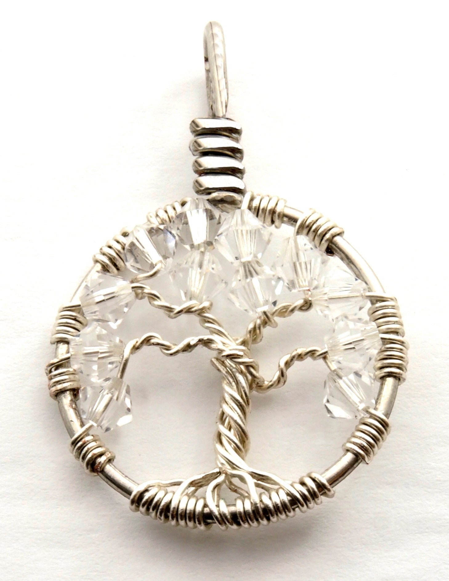 A handmade wire wrapped tree of life necklace beaded with 12 dazzling Swarovski® crystals in Crystal. You can choose between sterling silver or copper wire for your pendant.