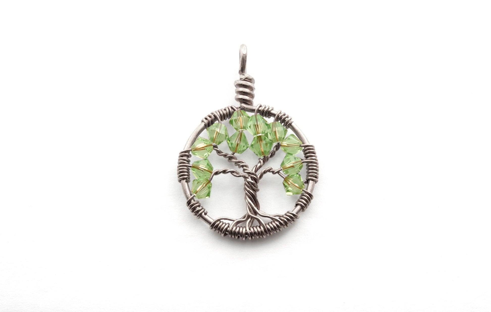 A handmade wire wrapped tree of life necklace beaded with beaded with 12 dazzling Swarovski® crystals in Peridot. You can choose between sterling silver or copper wire for your pendant.